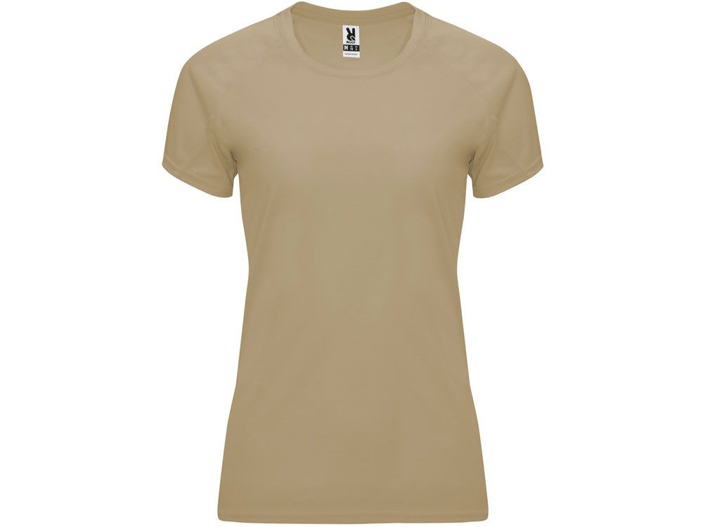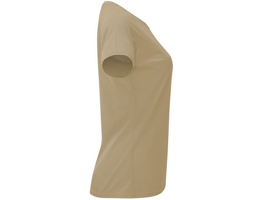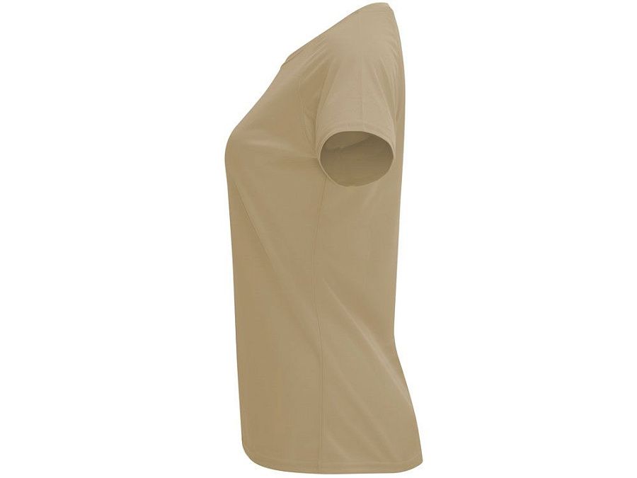 Спортивная футболка с коротким рукавом реглан для женщин. Круглый вырез горловины с отделкой плоским швом. Рукав сложного кроя для обеспечения дополнительного удобства при занятиях спортом. Отделка плоским швом с застилом по пройме и рукавам.